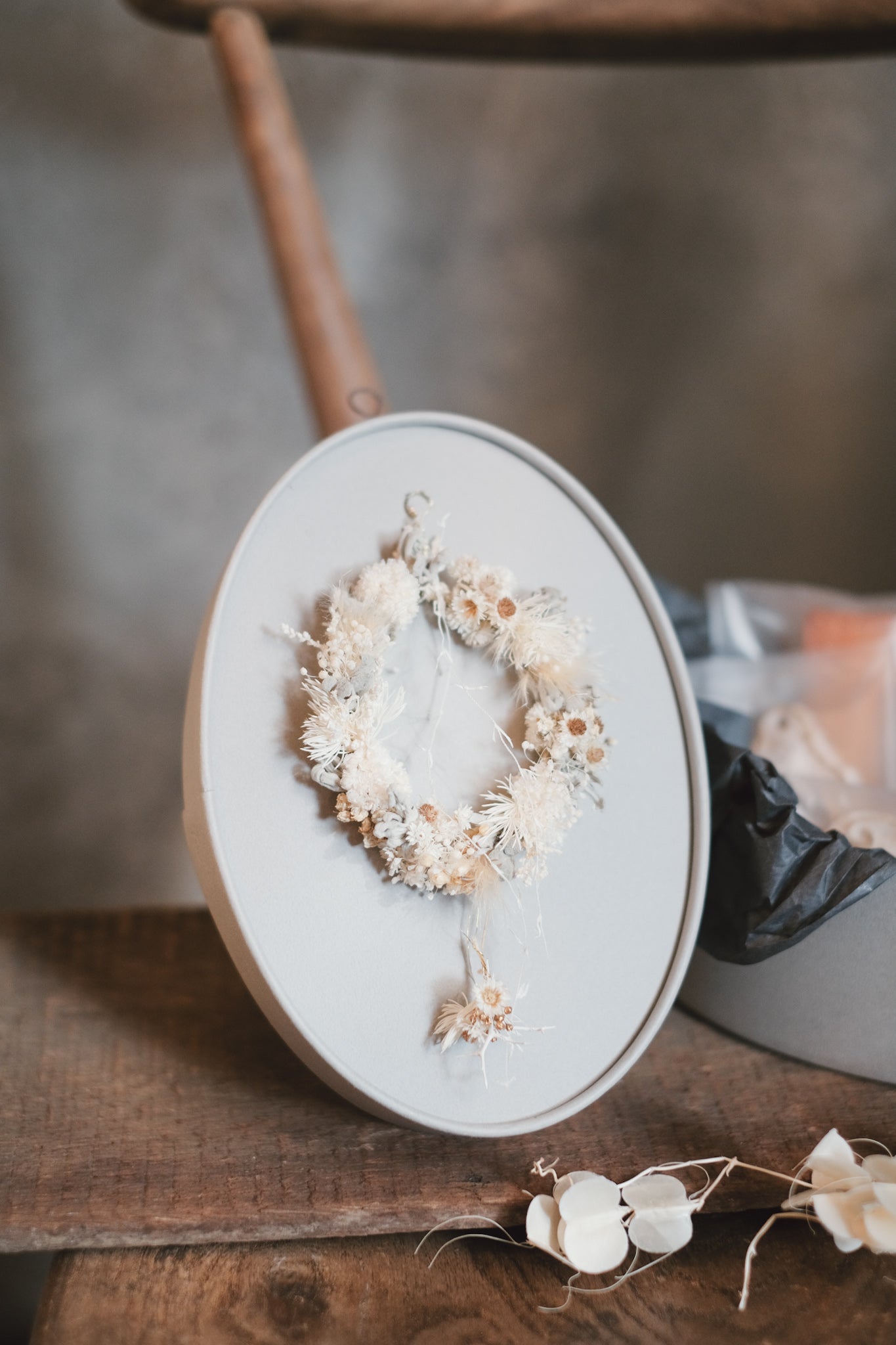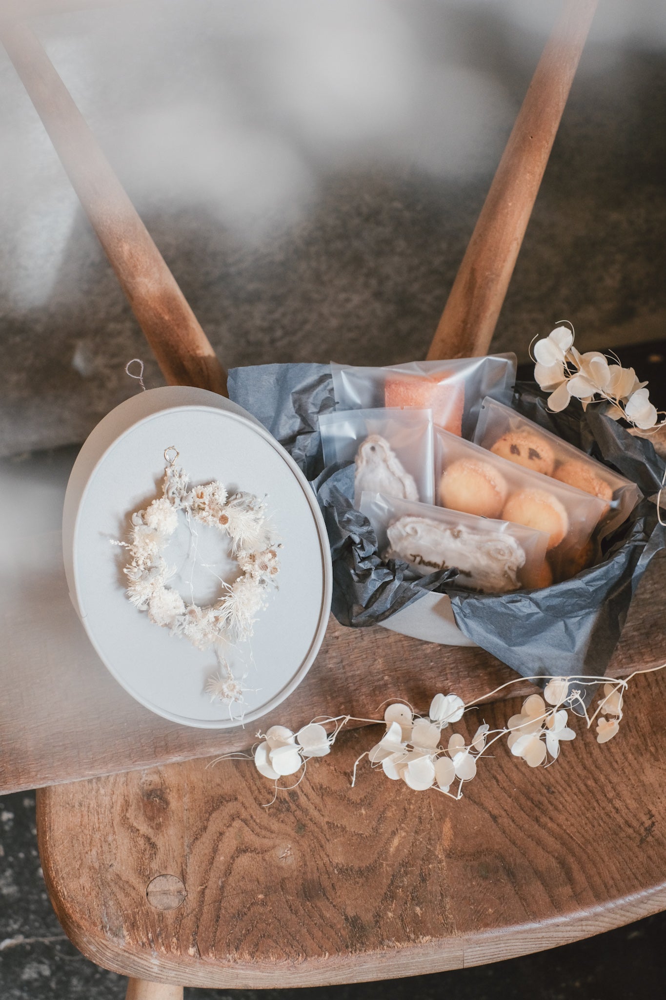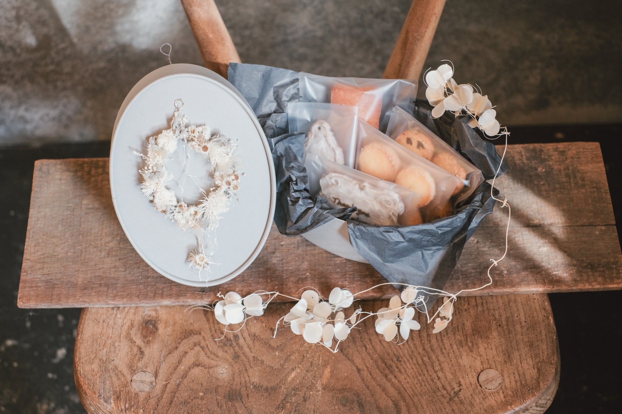 ギフトboxの蓋にリースを取り付けており、