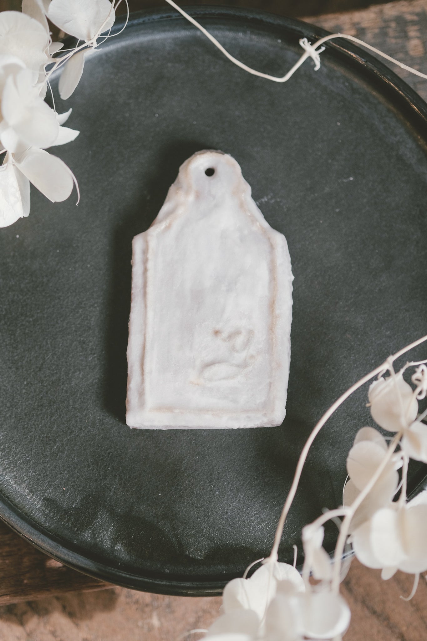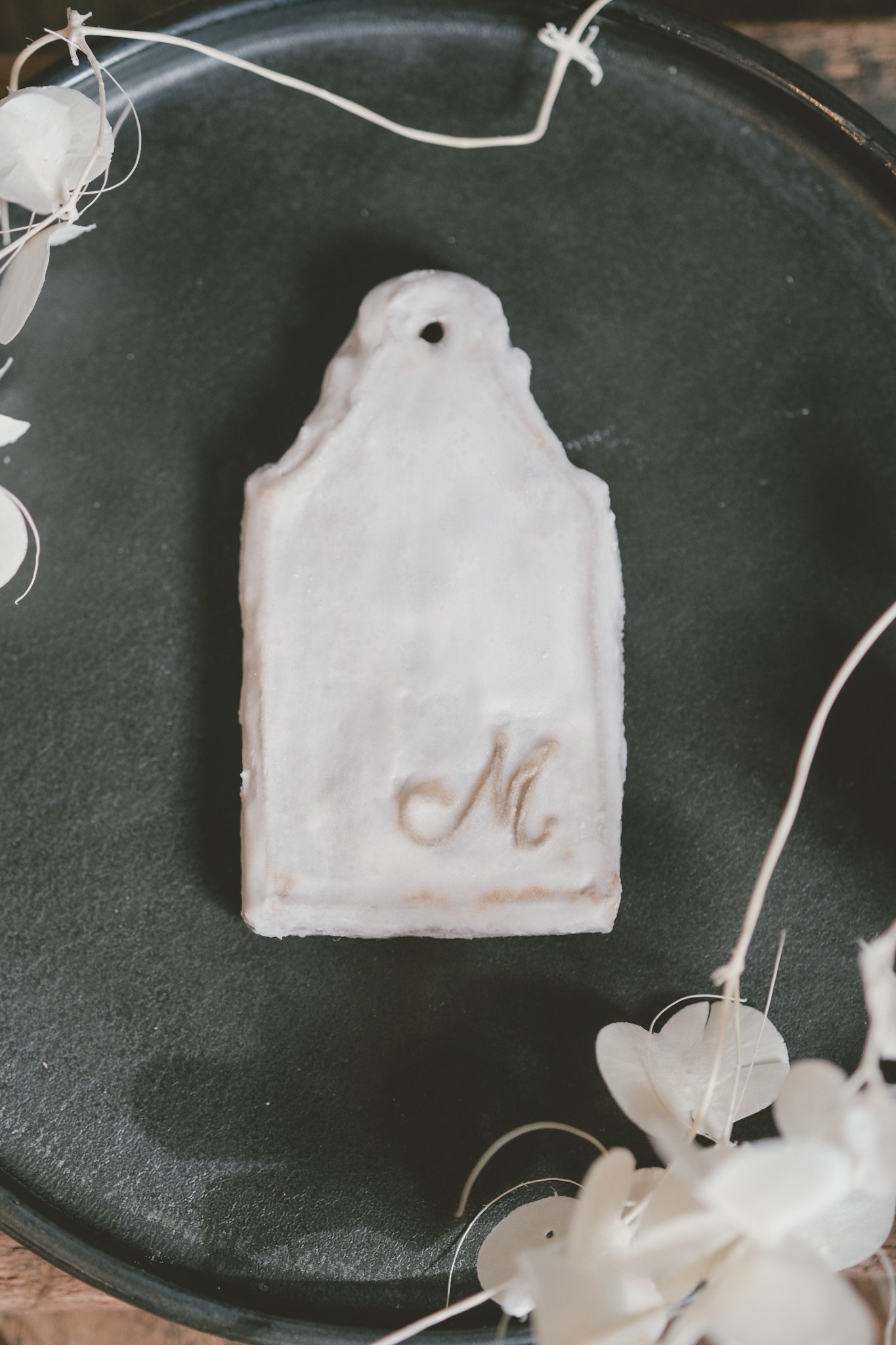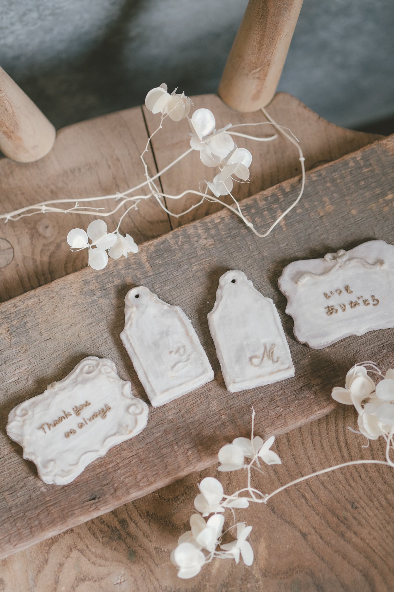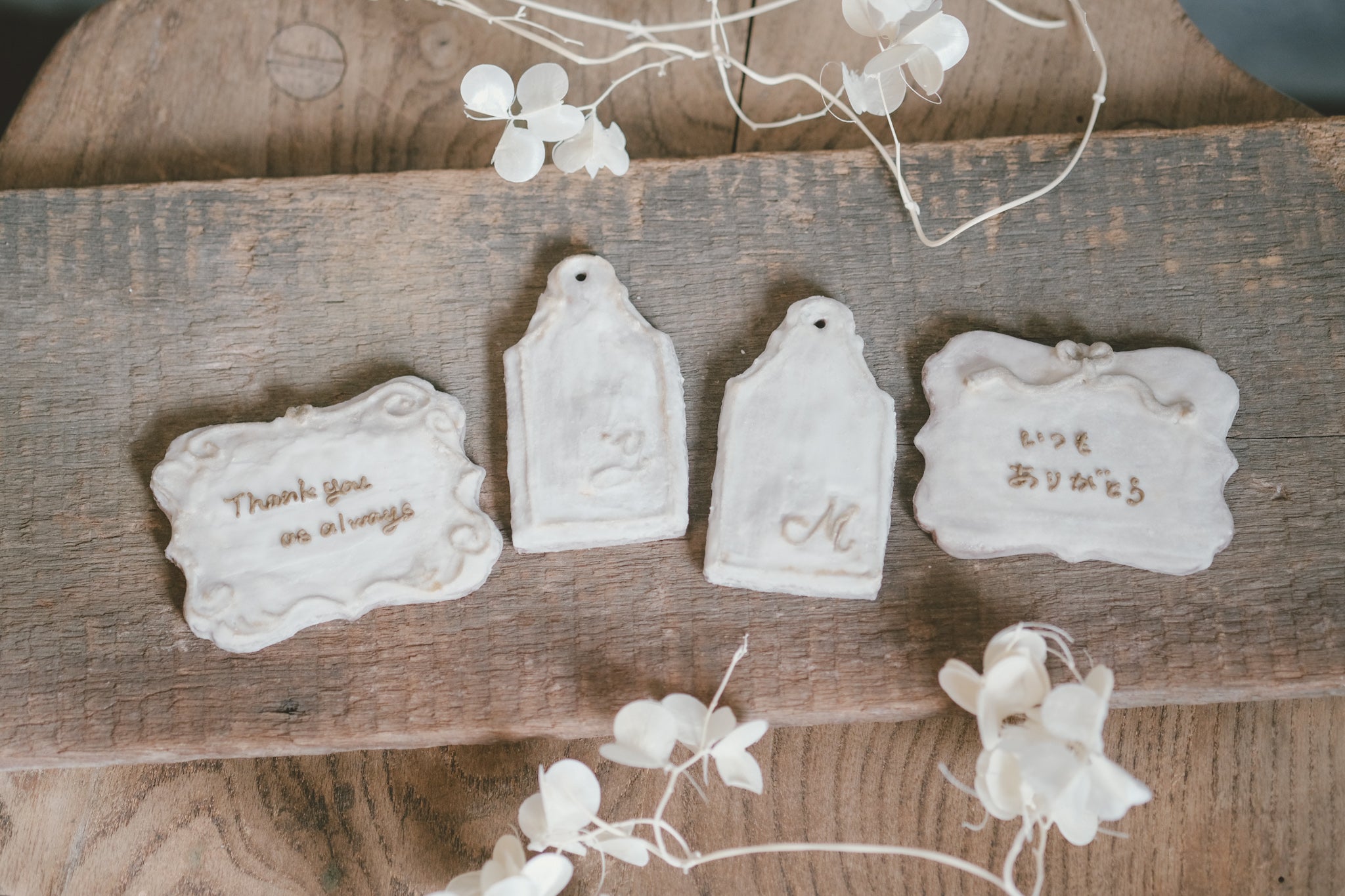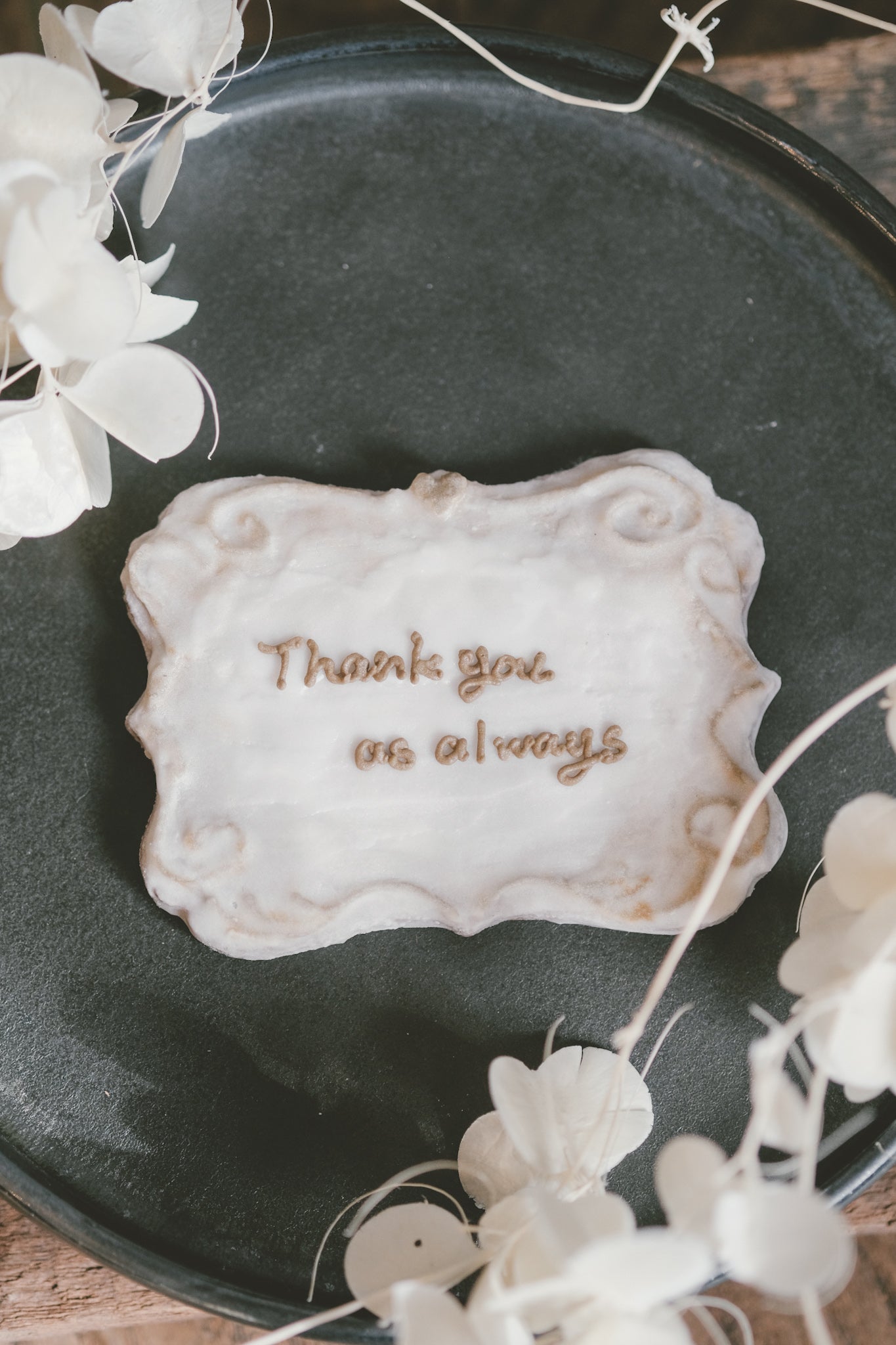 aiai特性のアンティーククッキープレートに、奥さまのイニシャルを施したクッキーと、感謝のメッセージを入れたクッキーを各1枚ずつご用意◎