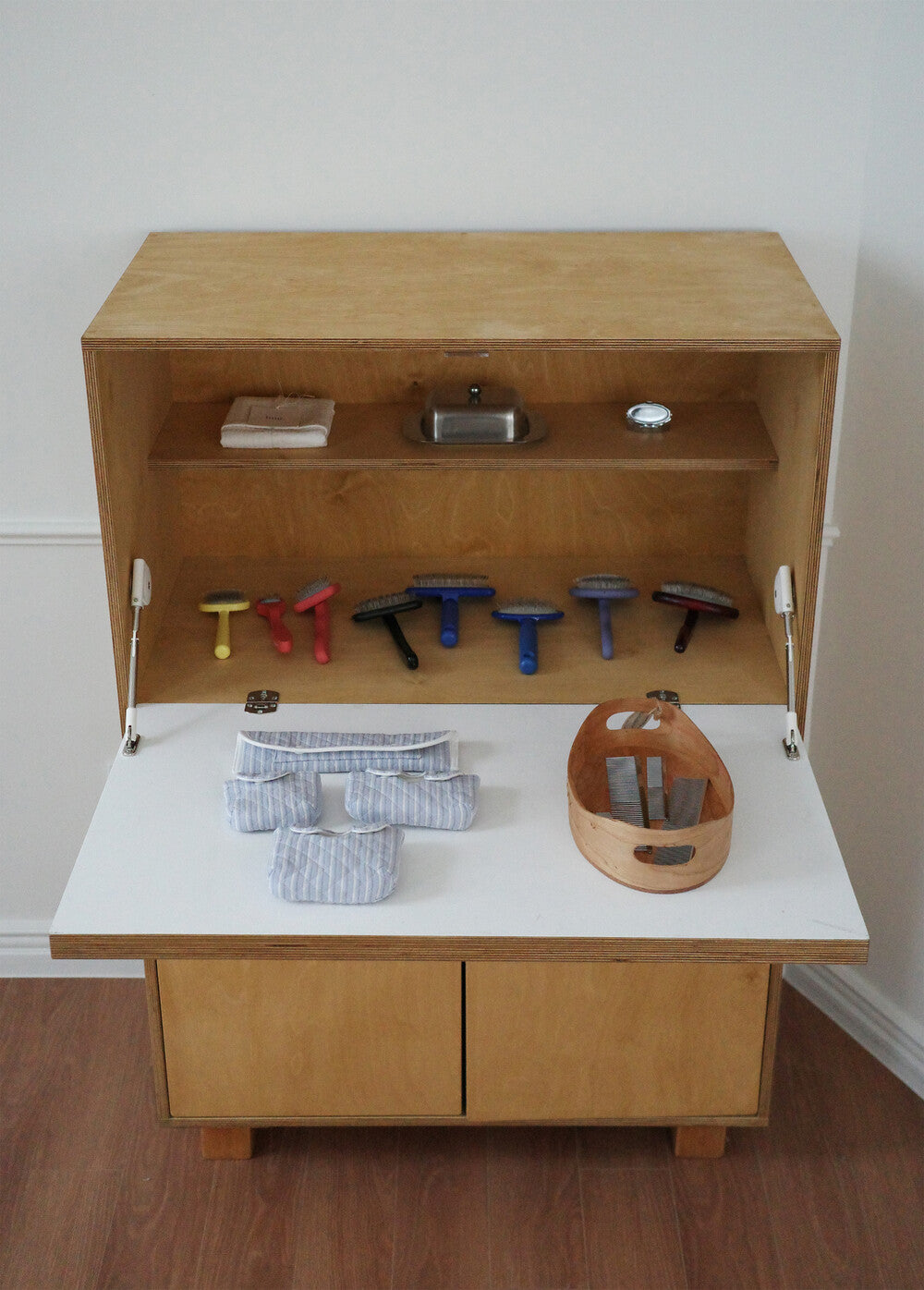 スリッカーピンが外部に露出しないよう包み込み、手を刺す心配なくバッグにすっぽり入れて持ち運びできます。