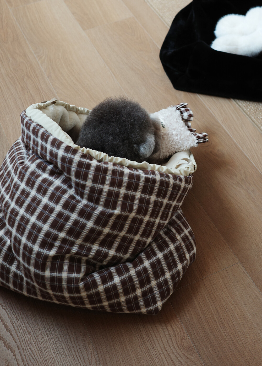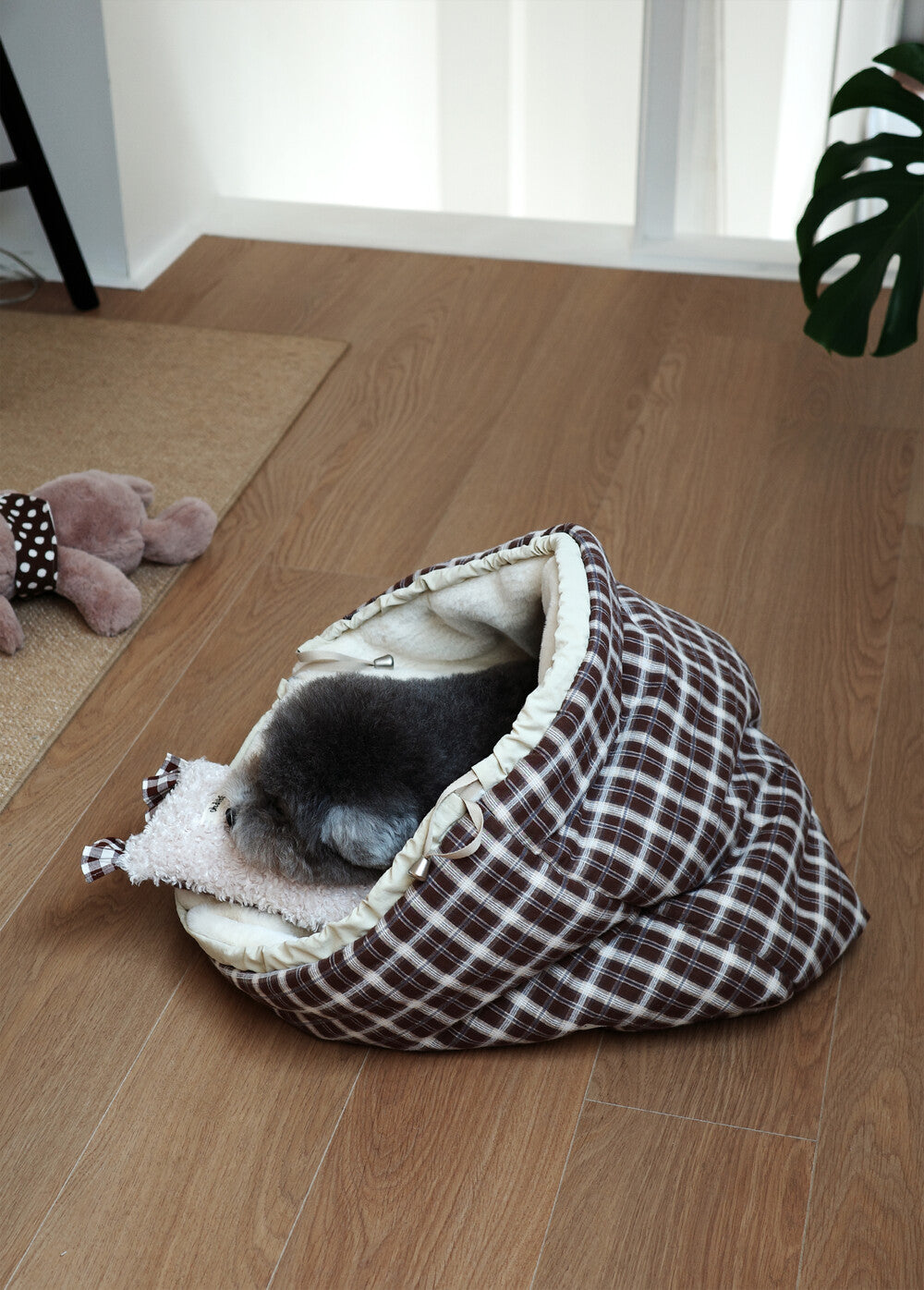 ドローストリングデザインが風を防ぎ、わんちゃんがより安心感を持って休めるようサポート◎