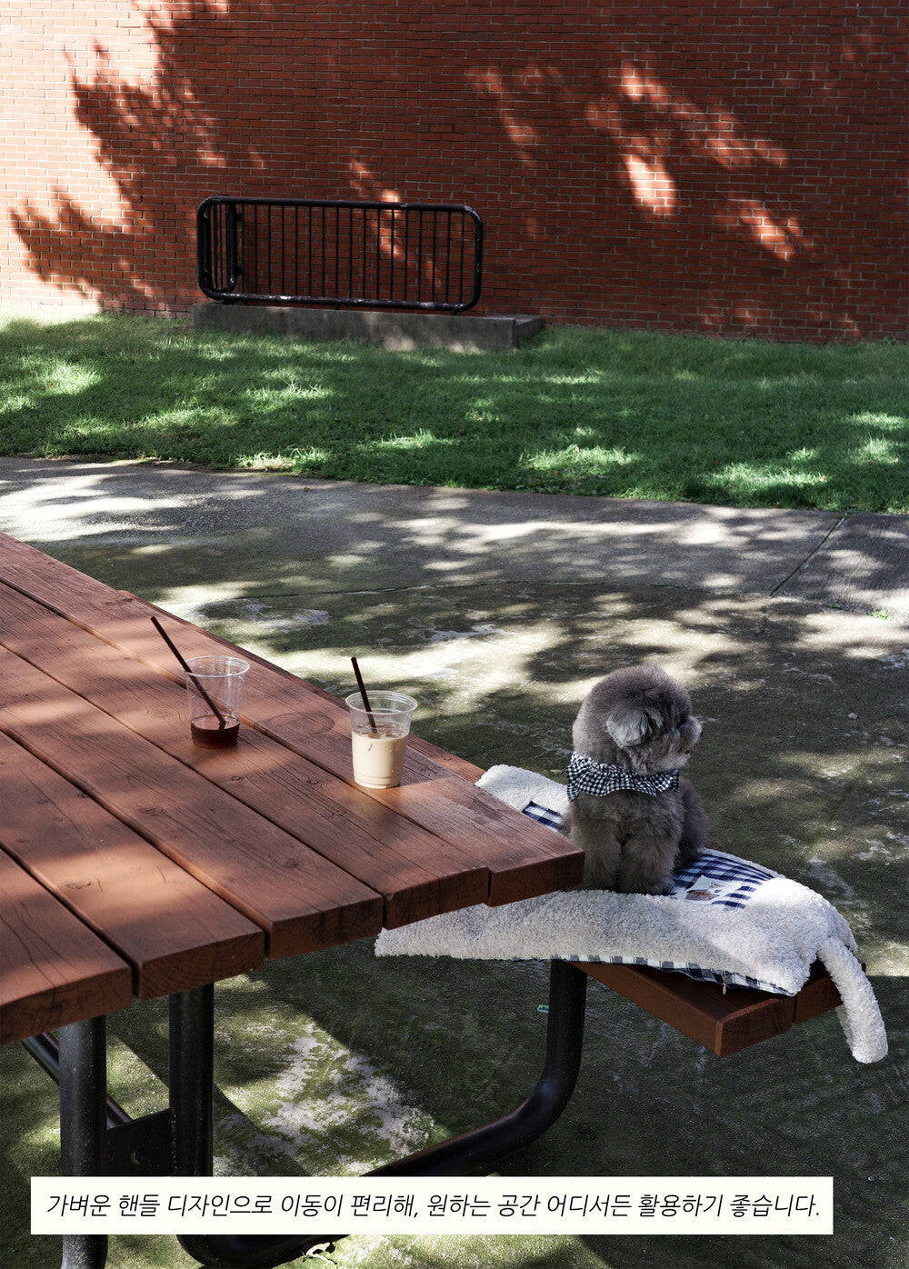 家の中はもちろん、ハンドル付きで持ち運びが簡単なので、お出かけ時の同伴場所でも一緒に使用可能です。